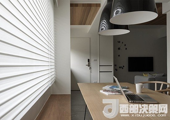 為了符合簡單純粹的設(shè)計(jì)理念,沒有電視柜的背景墻上放置了一個(gè)藝術(shù)時(shí)鐘,可移動(dòng)的數(shù)字設(shè)計(jì)展現(xiàn)了一種道家的精神。