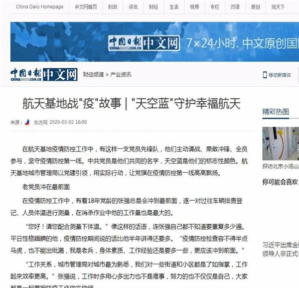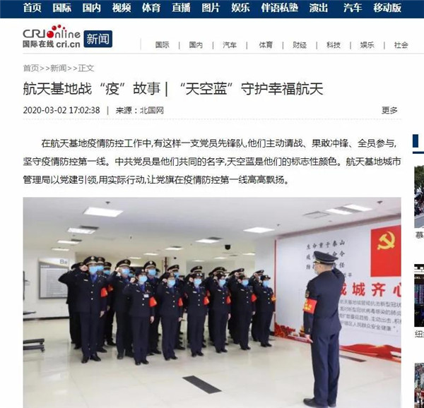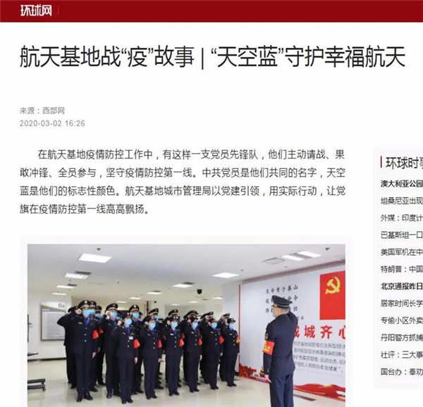 3月2日,航天基地《“天空藍(lán)”守護(hù)幸福航天》,講述了擁有18年黨齡的張強(qiáng)、退役士官魏斌、工作人緣好李鵬飛用行動展現(xiàn)共產(chǎn)黨人政治本色的積極實(shí)踐。國際在線、中國日報(bào)網(wǎng)、環(huán)球網(wǎng)、鳳凰網(wǎng)、西部網(wǎng)、三秦網(wǎng)、搜狐等近20家中央、省級、市級網(wǎng)絡(luò)媒體轉(zhuǎn)發(fā),網(wǎng)友產(chǎn)生強(qiáng)烈共鳴。