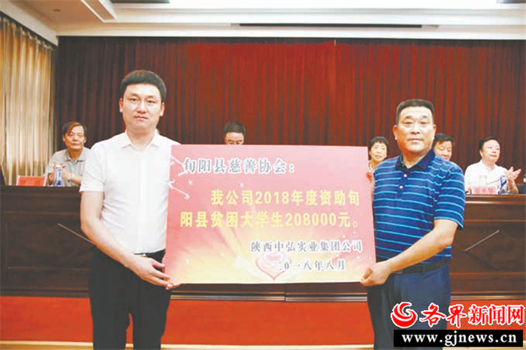 2018年8月,省政協(xié)委員、陜西中弘實業(yè)集團有限公司董事長徐浩向旬陽縣貧困大學(xué)生捐贈善款。
