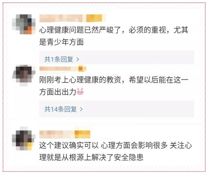 全國人大代表司富春建議,針對中小學(xué)校教師普及心理健康常識,實(shí)施教師心理健康教育資格認(rèn)證制度,實(shí)行班主任和專、兼職心理健康教育教師持證上崗制度。加強(qiáng)對中小學(xué)生實(shí)施心理健康教育。