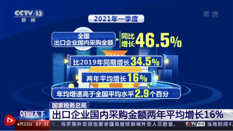 2021年一季度,海外需求復(fù)蘇繼續(xù)拉動(dòng)我國(guó)出口快速增長(zhǎng),全國(guó)出口企業(yè)國(guó)內(nèi)采購(gòu)金額同比增長(zhǎng)46.5%,比2019年同期增長(zhǎng)34.5%,兩年平均增長(zhǎng)16%,年均增速高于全國(guó)平均水平2.9個(gè)百分點(diǎn)。