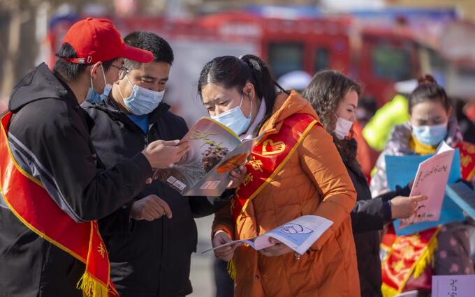 2021年12月4日上午,洛浦縣科技局工作人員在該縣艾德萊斯廣場(chǎng),正在向當(dāng)?shù)鼐用襁M(jìn)行講解“科普知識(shí)”。買(mǎi)買(mǎi)提艾力·艾尼瓦爾攝