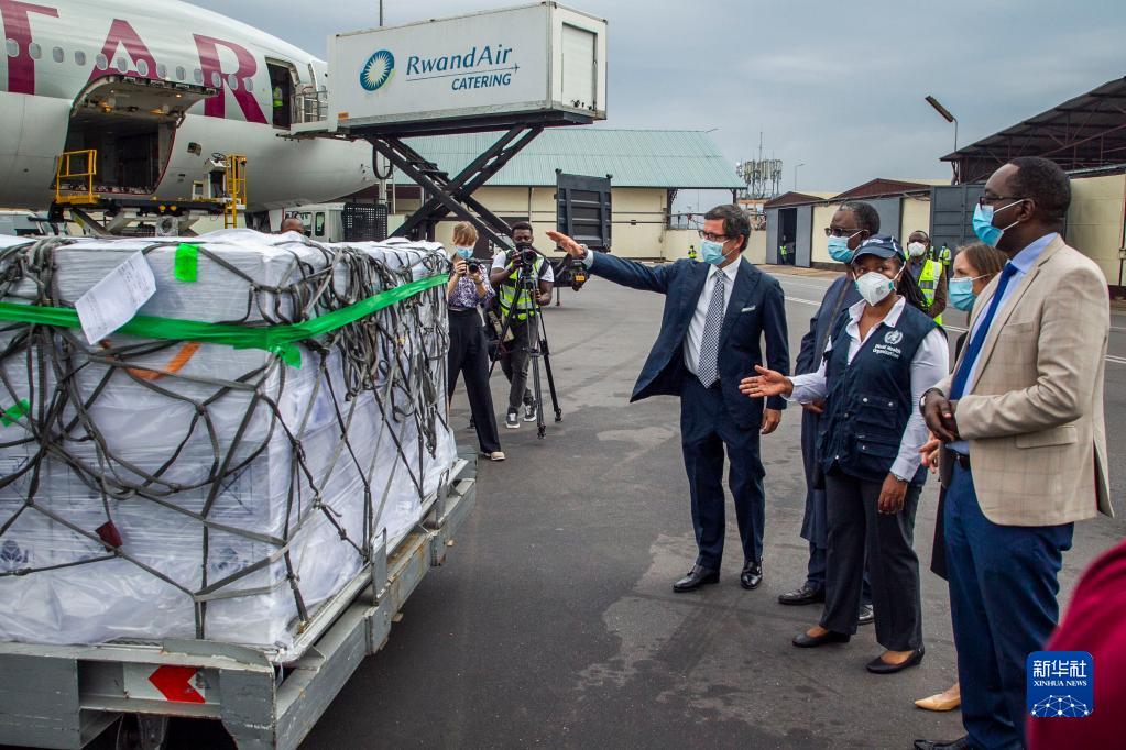 盧旺達(dá)衛(wèi)生部長達(dá)尼埃爾·恩加米杰(右一)等官員在基加利國際機(jī)場查看該國首批通過COVAX計(jì)劃收到的新冠疫苗(2021年3月3日)。新華社發(fā)(西里爾·恩德格亞攝)