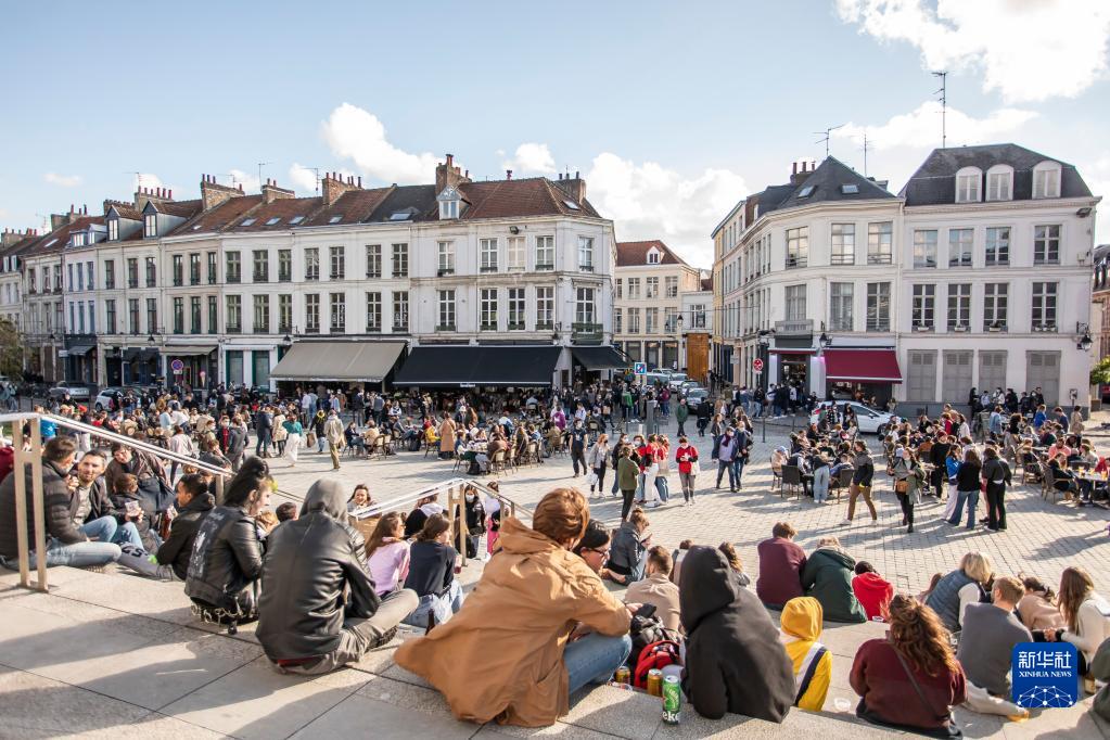 人們?cè)诜▏餇柺兄行男蓍e(2021年5月19日攝)。新華社發(fā)(塞巴斯蒂安·庫爾吉攝)