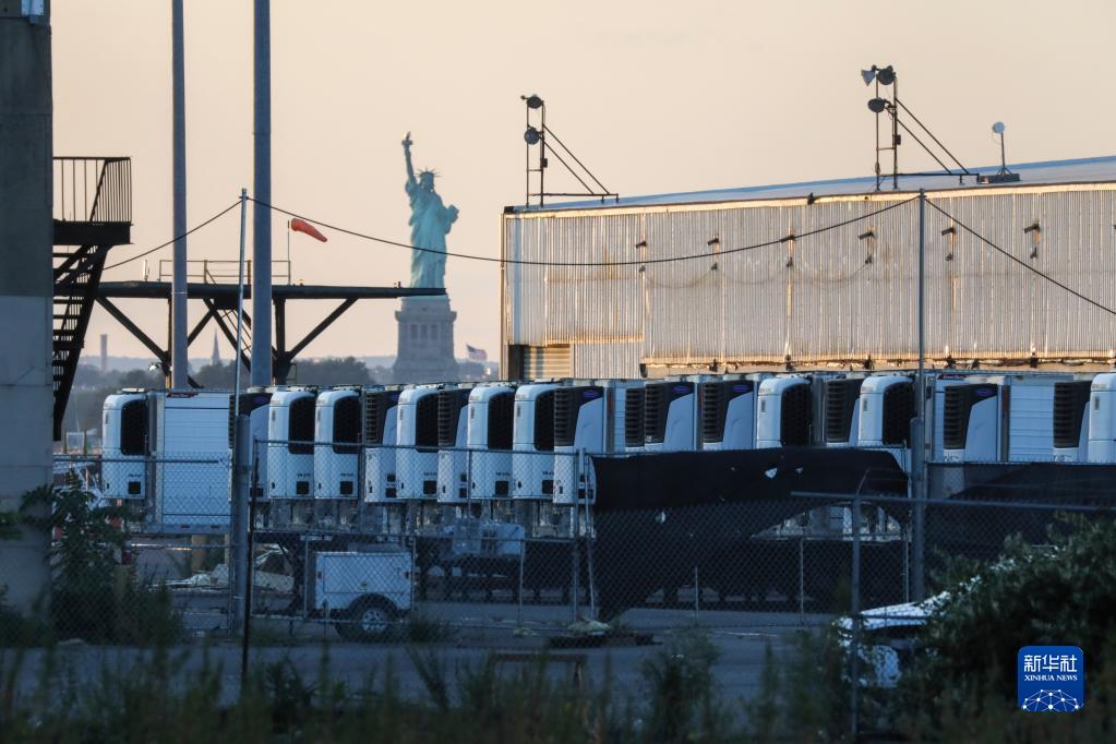這是在美國紐約布魯克林拍攝的一處臨時(shí)停尸場內(nèi)存放新冠患者遺體的冷藏車(2021年9月6日攝)。新華社記者 王迎 攝