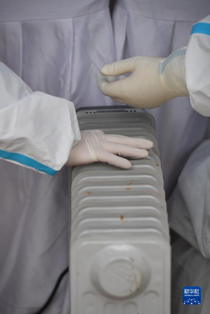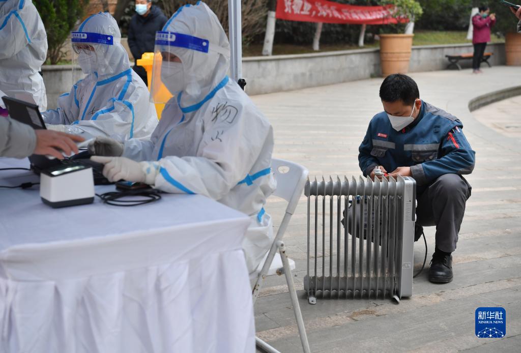 12月23日,在西安一小區(qū),物業(yè)人員為核酸檢測(cè)點(diǎn)的工作人員安裝電暖器。新華社記者 邵瑞 攝