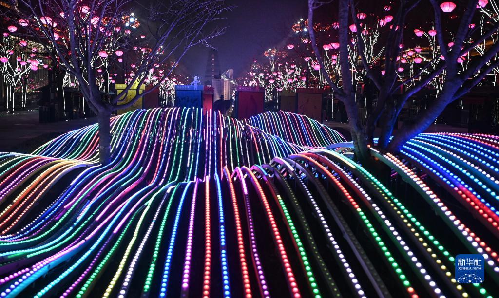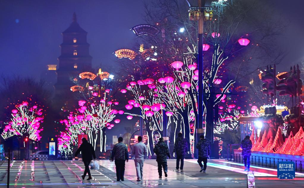 春節(jié)臨近,西安市大唐不夜城點(diǎn)亮璀璨奪目的燈光,迎接新春佳節(jié)的到來。
