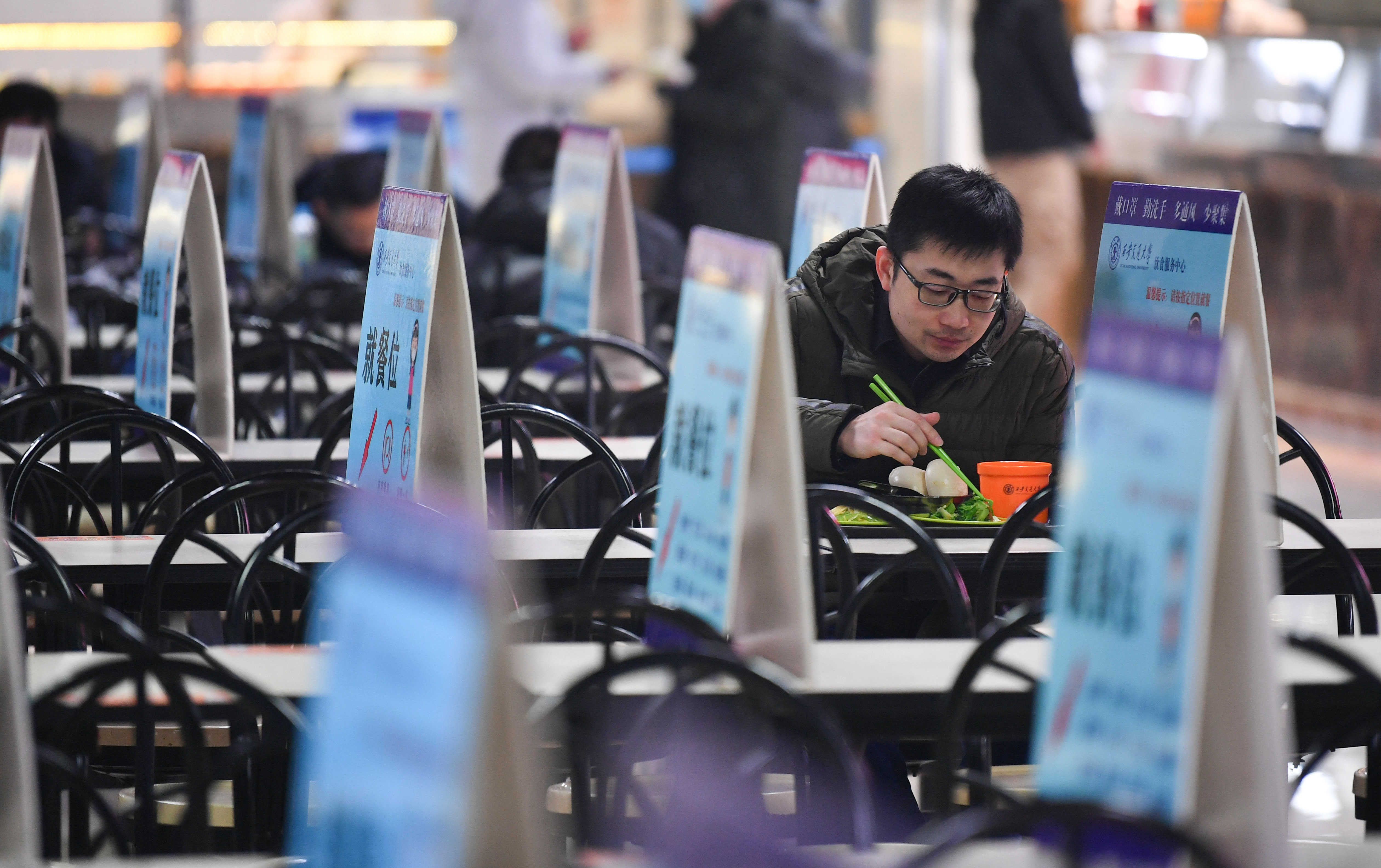 1月29日,一名留校學(xué)生在西安交通大學(xué)興慶校區(qū)校園食堂用餐。新華社記者 張博文 攝