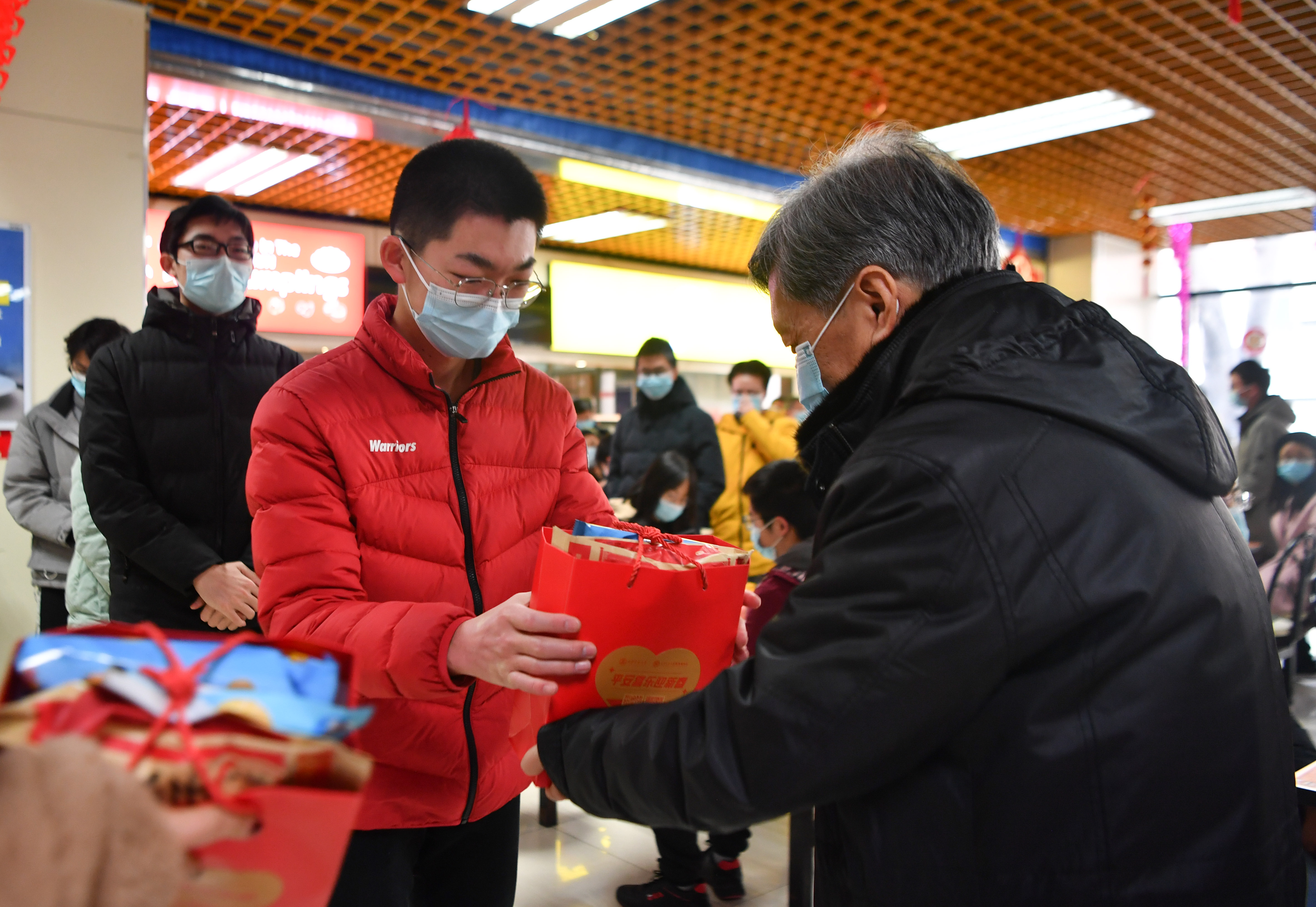 1月29日,西安交通大學(xué)留校學(xué)生排隊(duì)領(lǐng)取學(xué)校發(fā)放的禮包。新華社記者 張博文 攝