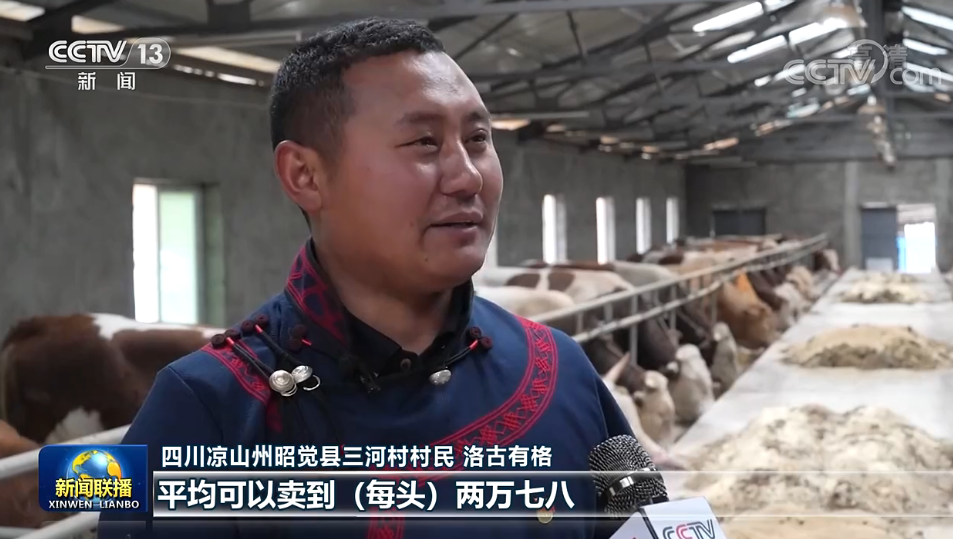 四川涼山州昭覺縣三河村村民 洛古有格:當時總書記來的時候,我們這個養(yǎng)牛只有十幾頭。通過發(fā)展,我們三河村有了1000多頭這個西門塔爾牛?,F(xiàn)在我們這個牛,平均可以賣到(每頭)兩萬七八,大的可以賣到三萬多元,效益特別好。