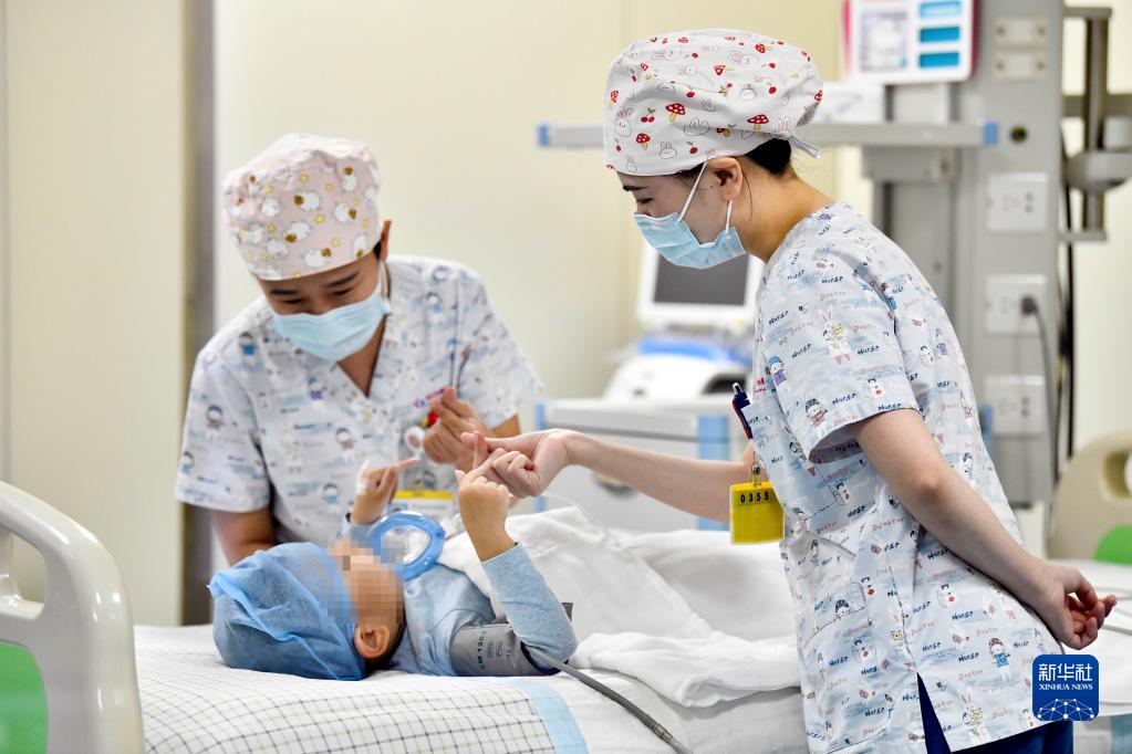 在山東省棗莊市婦幼保健院兒童ICU病房,醫(yī)護(hù)人員為完成靶向治療藥物諾西那生鈉的4歲脊髓性肌萎縮癥患兒加油鼓勁(2022年1月1日攝)。諾西那生鈉注射液是我國(guó)首個(gè)獲批治療脊髓性肌萎縮癥的進(jìn)口藥物,2019年進(jìn)入中國(guó)市場(chǎng)時(shí),每針價(jià)格近70萬(wàn)元。在2021年國(guó)家醫(yī)保目錄藥品談判中,以3.3萬(wàn)元每針的價(jià)格進(jìn)入新版醫(yī)保藥品目錄。新華社記者 郭緒雷 攝