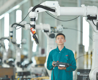 河北省任丘市通過(guò)搭建科技創(chuàng)新平臺(tái),建設(shè)研發(fā)中心、技術(shù)研究院,持續(xù)深化產(chǎn)學(xué)研合作交流,推動(dòng)企業(yè)轉(zhuǎn)型升級(jí)。圖為工作人員在生產(chǎn)車(chē)間調(diào)試機(jī)器人。 |