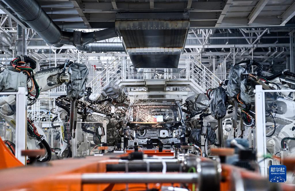 10月17日,在吉林長春中國第一汽車集團(tuán)有限公司紅旗繁榮工廠焊裝車間內(nèi),焊裝機(jī)器人在生產(chǎn)線上焊接車身。新華社記者 顏麟蘊 攝