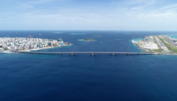 這是在馬爾代夫航拍的連接首都馬累和機(jī)場島的中馬友誼大橋(2019年8月30日攝)。新華社發(fā)(王明亮 攝)