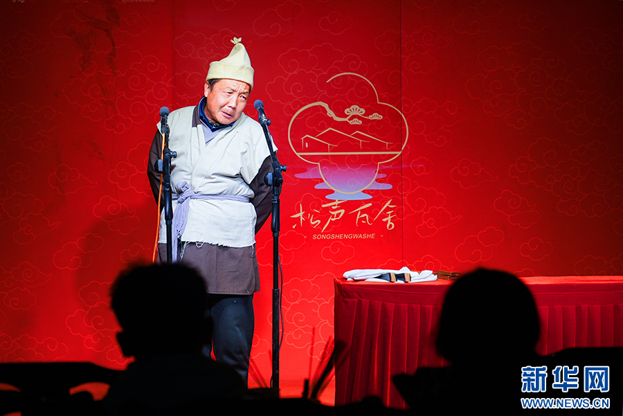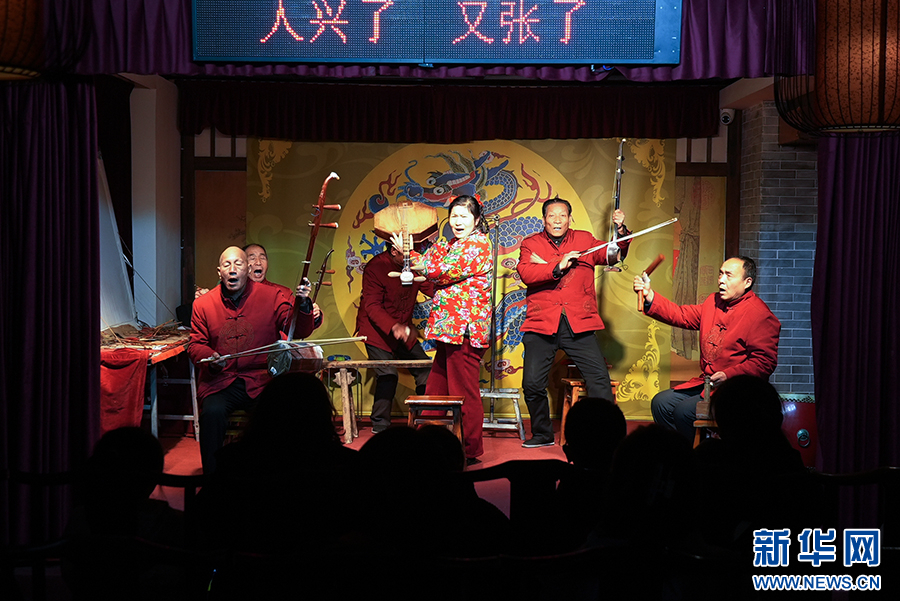 在西安永興坊——陜西非遺文化特色街區(qū),今年52歲的秦腔演員王波,為游客表演國(guó)家級(jí)非遺陜西地方曲藝“眉戶”經(jīng)典片段《張連賣布》。新華網(wǎng) 楊喜龍 攝