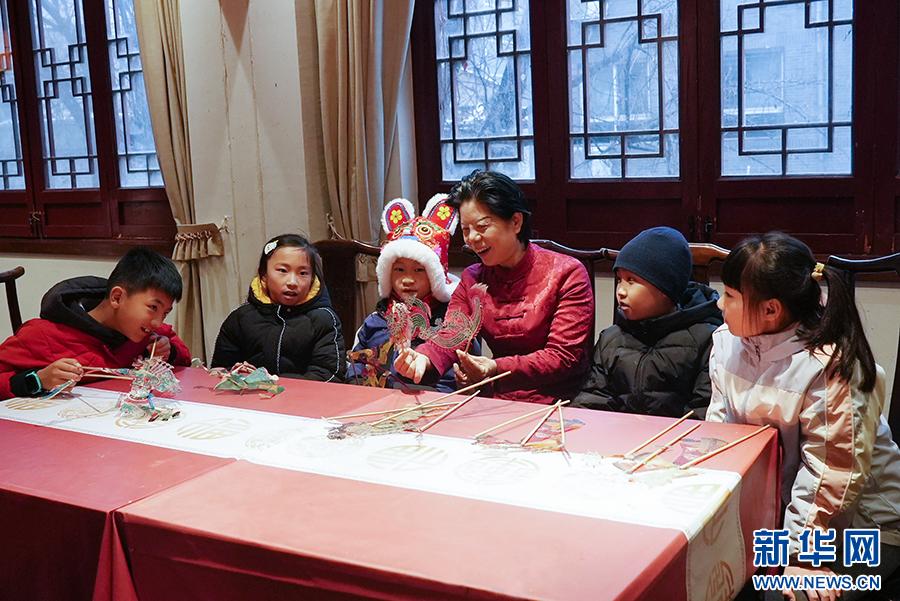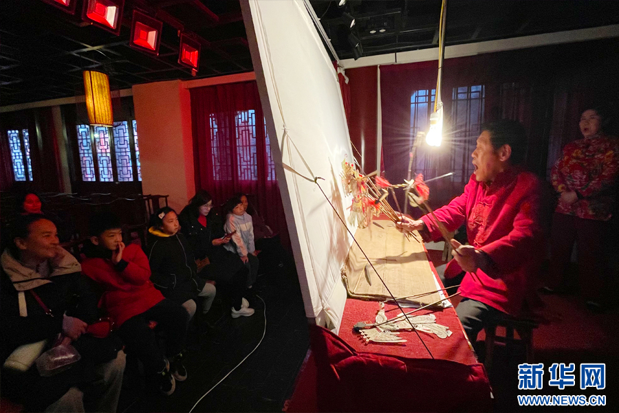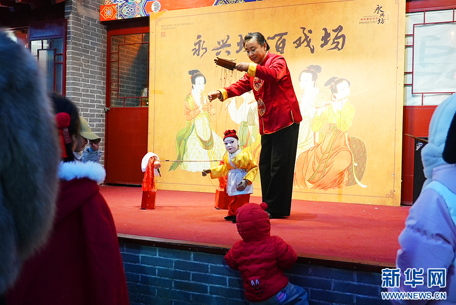 在西安永興坊——陜西非遺文化特色街區(qū),今年56歲的王春桃,為小朋友們表演國(guó)家級(jí)非遺合陽(yáng)提線木偶戲《賣雜貨》。 新華網(wǎng) 楊喜龍 攝