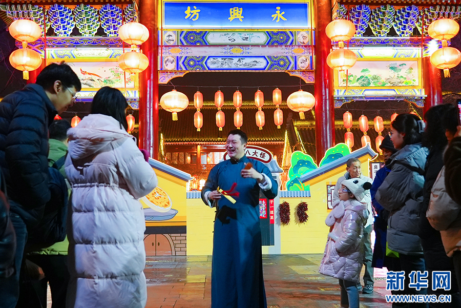 在西安永興坊——陜西非遺文化特色街區(qū),今年30歲的陜派相聲演員張浩哲,給游客們表演國(guó)家級(jí)非遺陜西快板。新華網(wǎng) 楊喜龍 攝