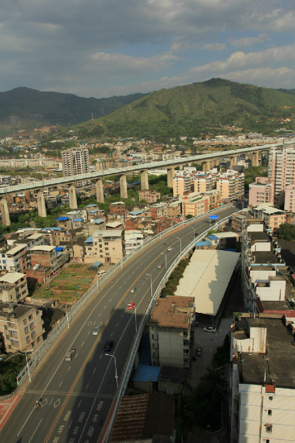 龍巖市東興高架橋位于龍巖市中心城區(qū)東北部,總投資9926萬(wàn)元, 城市主干道Ⅱ級(jí),為東興路東風(fēng)橋至南環(huán)路段,該路段長(zhǎng)約740米,屬城市內(nèi)環(huán)線,車(chē)流量大,沿線與登高東路、鐵路、棋盤(pán)路及南環(huán)路相交,與鐵路平交處該路段高架橋上跨鐵路;在登高東路與東興路高架橋之間設(shè)置A、B、C、D匝道(均為單向單車(chē)道)利用4條匝道將既有登高東路與東興路相連,從而在東興路與登高路之間形成半苜蓿葉型互通式立交。高架橋全長(zhǎng)461.77米,沿線與登高東路、漳龍鐵路、棋盤(pán)路及支小路相交,本工程采用高架上跨形式,跨越相交道路與鐵路,完全解決了與鐵路平交的安全隱患。橋梁上部結(jié)構(gòu)采用(18.5+20+20)m普通鋼筋砼連續(xù)梁及25m、30m預(yù)應(yīng)力砼空心板梁,橋面連續(xù),下部采用樁接立柱接蓋梁橋墩與U型橋臺(tái),墩臺(tái)基礎(chǔ)采用鉆孔灌注樁基礎(chǔ)。