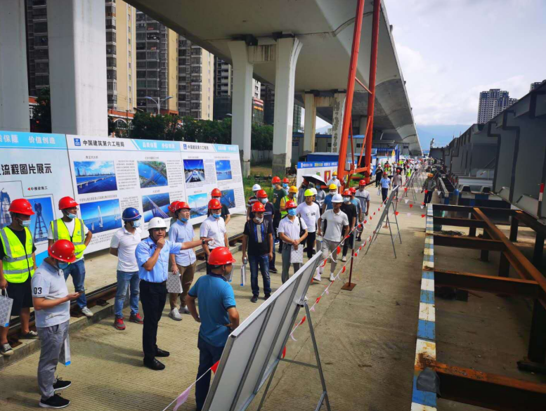 2020年6月28日,由龍巖城市發(fā)展集團(tuán)有限公司主辦,龍巖市政建設(shè)集團(tuán)有限公司(市城投公司)承辦,北京鐵研建設(shè)監(jiān)理有限公司、中國(guó)建筑第六工程局有限公司、中冶(上海)鋼結(jié)構(gòu)科技有限公司協(xié)辦的龍巖大道高架橋項(xiàng)目質(zhì)量安全標(biāo)準(zhǔn)化觀摩會(huì)在龍巖大道高架橋主橋鋼箱梁工程現(xiàn)場(chǎng)舉行。觀摩會(huì)分拼裝區(qū)域、提升站區(qū)域、頂推滑移區(qū)域、步履滑移區(qū)域及主橋轉(zhuǎn)體區(qū)域分別展示了龍巖大橋主橋鋼結(jié)構(gòu)拼裝、提升、弧形頂推滑移、步履滑移等新工藝及主塔“水平二次轉(zhuǎn)體”、鋼箱梁頂推、斜拉索施工技術(shù)